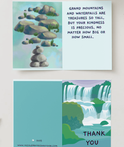 Who says greeting cards have gone out of style? This 5-pack of folded greeting cards features mountains and waterfalls with the inside inscription: “Grand mountains and waterfalls are treasures so tall, but your kindness is precious, no matter how big or how small.” Design and quote by Nicole Fratrich, printed through a third-party.